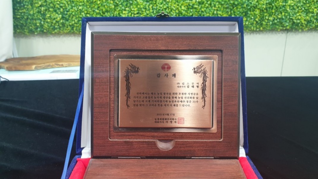 2021년 6월 농경과원예(주)에서 감사퍠를 수여 받았습니다.